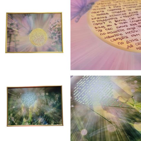 Творческият ѝ процес е силно интуитивен и се вдъхновява от личните послания, които канализира чрез работа с Акашовите записи. Често създава индивидуални картини с ръчно изписани текстове, които отразяват вътрешния свят и енергията на човека, за когото са предназначени.